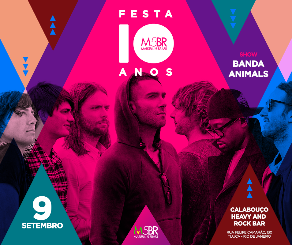 Em 2017, o Maroon 5 Brasil completa 10 anos e vai comemorar em grande estilo, com uma super festa no Rio de Janeiro! A festa acontecerá no dia 9 de Setembro no Bar Calabouço e irá contar com um show especial da banda cover Animals, que irá tocar os grandes sucessos do Maroon 5 além de aquecer os fãs para o Rock In Rio. Além do show, a festa também contará com sorteios exclusivos, além de algumas outras surpresas… 😉